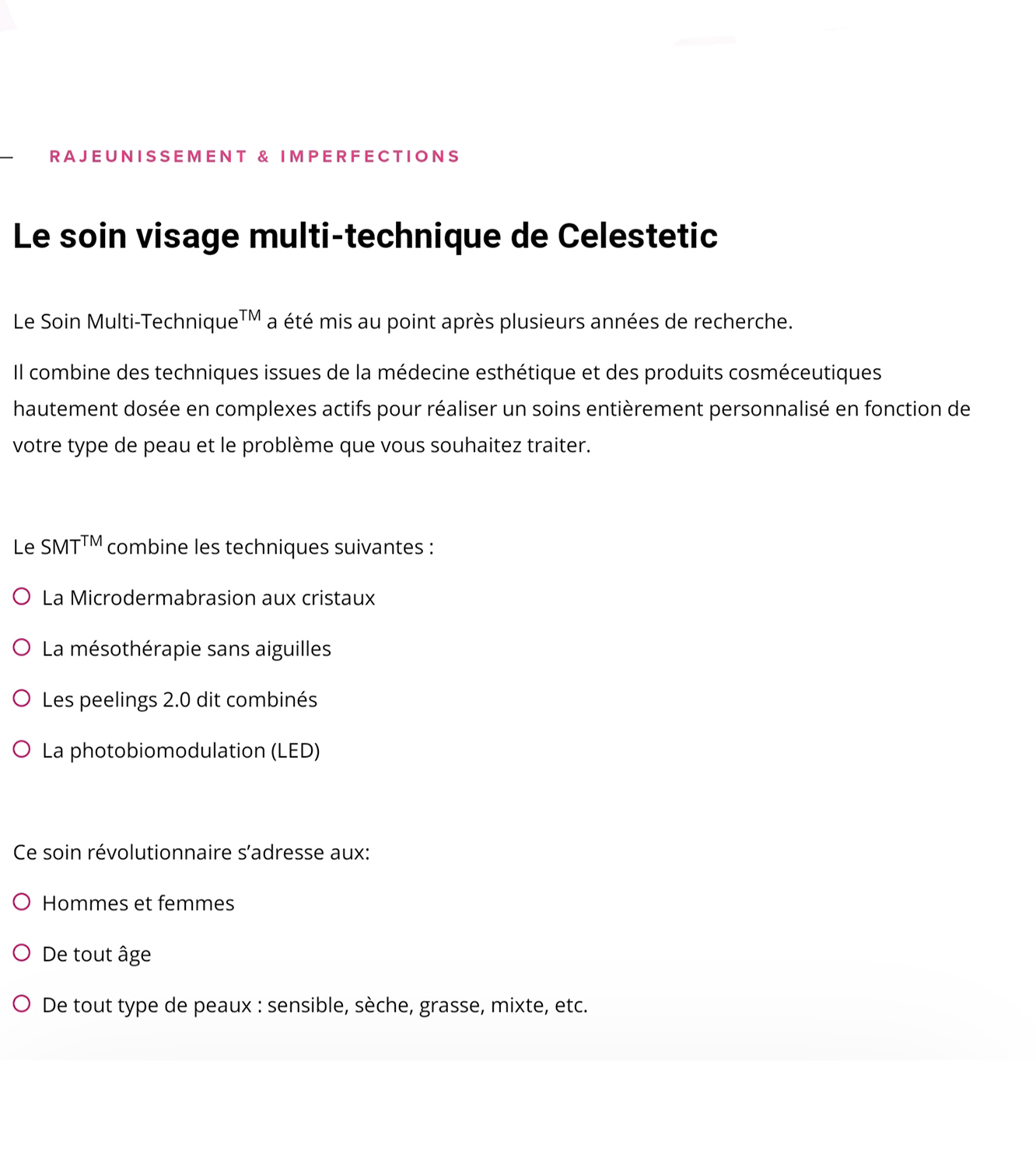 Le Soin Multi-Technique de Celestetic combine des techniques issues de la médecine esthétique et des produits cosméceutiques hautement dosés en complexes actifs pour réaliser un soin entièrement personnalisé en fonction de votre type de peau et le problème que vous souhaitez traiter.