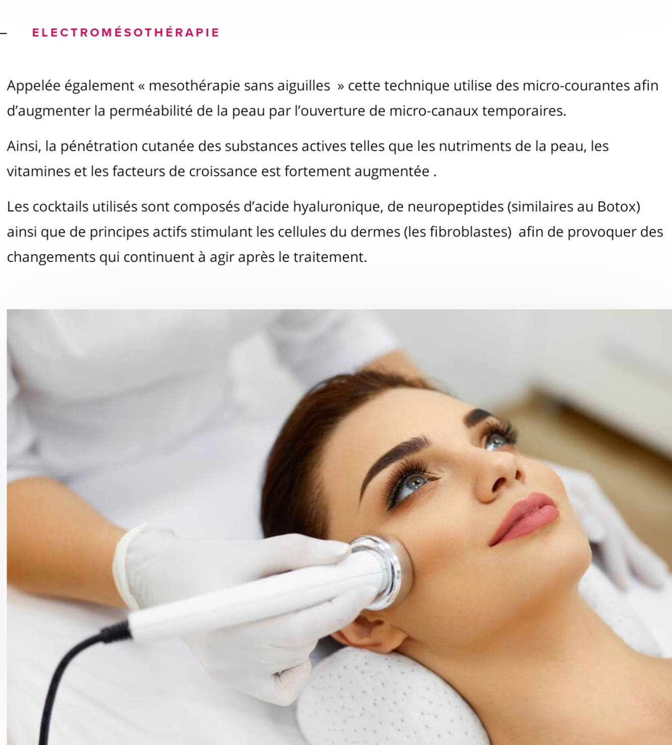 La radiofrequence est surtout utile pour lutter contre le relâchement de la peau (ovale du visage, cou, aspect fripé des joues et des pattes d’oie, ventre, bras…). Les cures sont personnalisées en fonction de vos besoins.